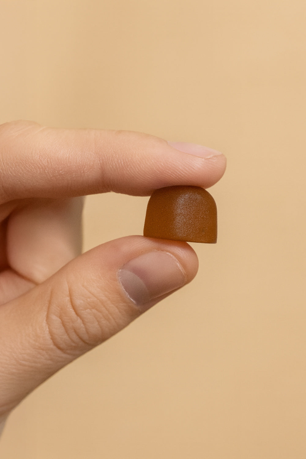Silný extrakt z kořene ashwagandhy (Withania somnifera) – používáme koncentrovaný 6:1 extrakt, přičemž denní dávka (2 gumídci) odpovídá 600 mg sušeného kořene.